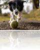 Sasvērtā fotoattēls, kurā suns skrien pakaļ bumbiņai