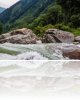 ūdens plūst caur akmeņiem pie zaļā kalna