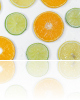 Spilgtas citrusaugļu šķēles uz balta fona