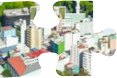 Balti un zaļi namiņi pie zila jūras