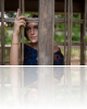 Satura sieviete stāv pie koka stieņiem