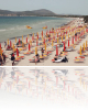 Tūristi sauļojas uz dzelteniem un sarkaniem pludmales krēsliem